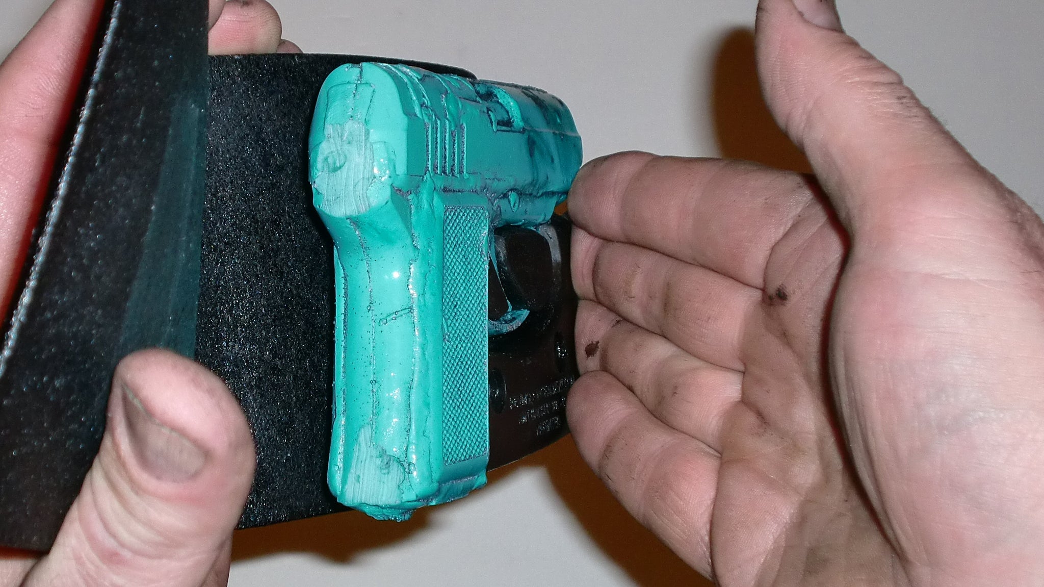 This holster uses a molded hard rubber retaining insert to secure the pistol in place inside the leather covering when the covering is closed.  The retainer also keeps the thickness of the holster uniform, insuring the gun won’t print.  To draw it, take the wallet holster out of your pocket, open the cover, and simply flip the pistol out into your other hand.
