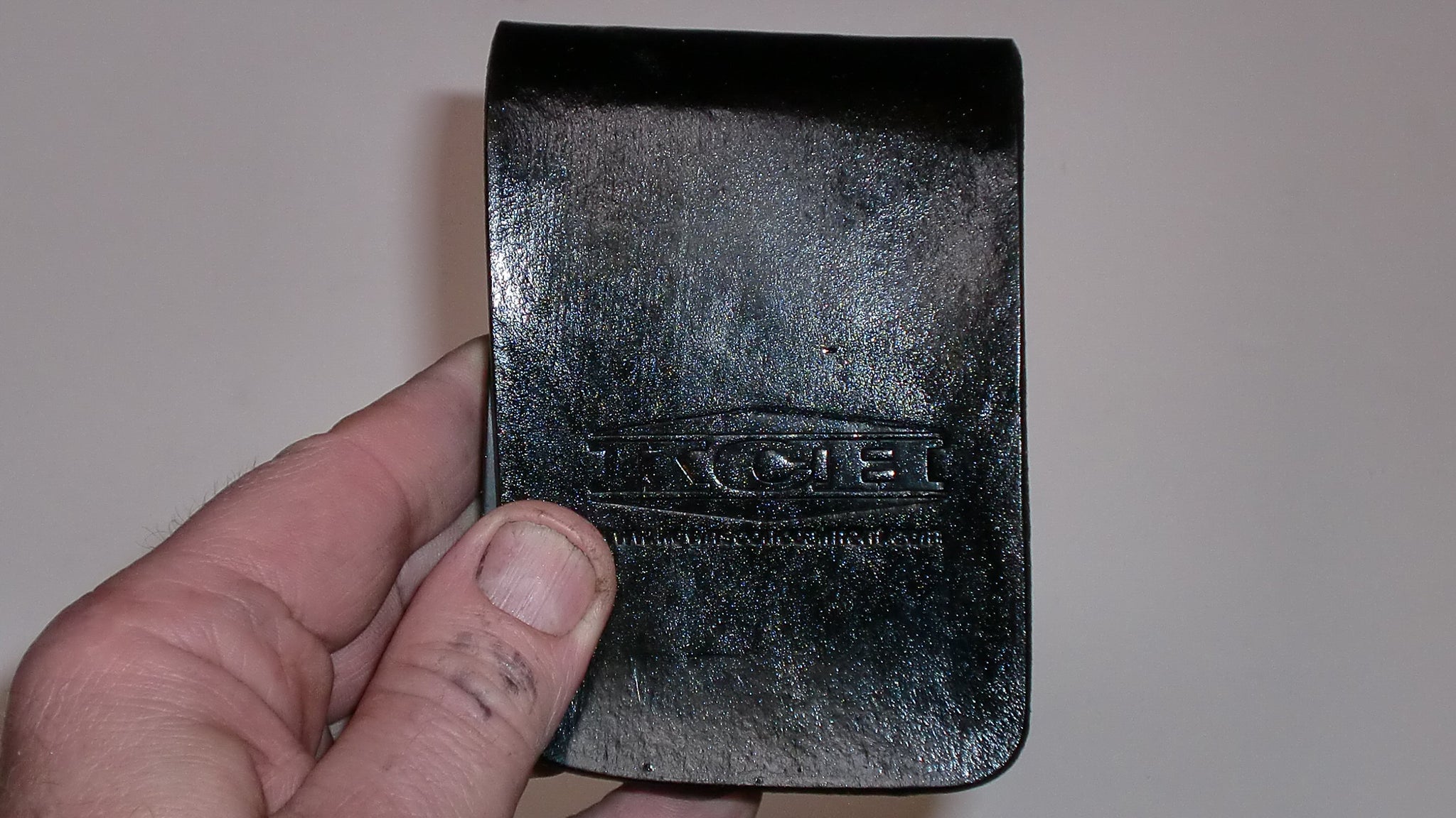 This holster uses a molded hard rubber retaining insert to secure the pistol in place inside the leather covering when the covering is closed. The retainer also keeps the thickness of the holster uniform, insuring the gun won’t print. To draw it, take the wallet holster out of your pocket, open the cover, and simply flip the pistol out into your other hand.