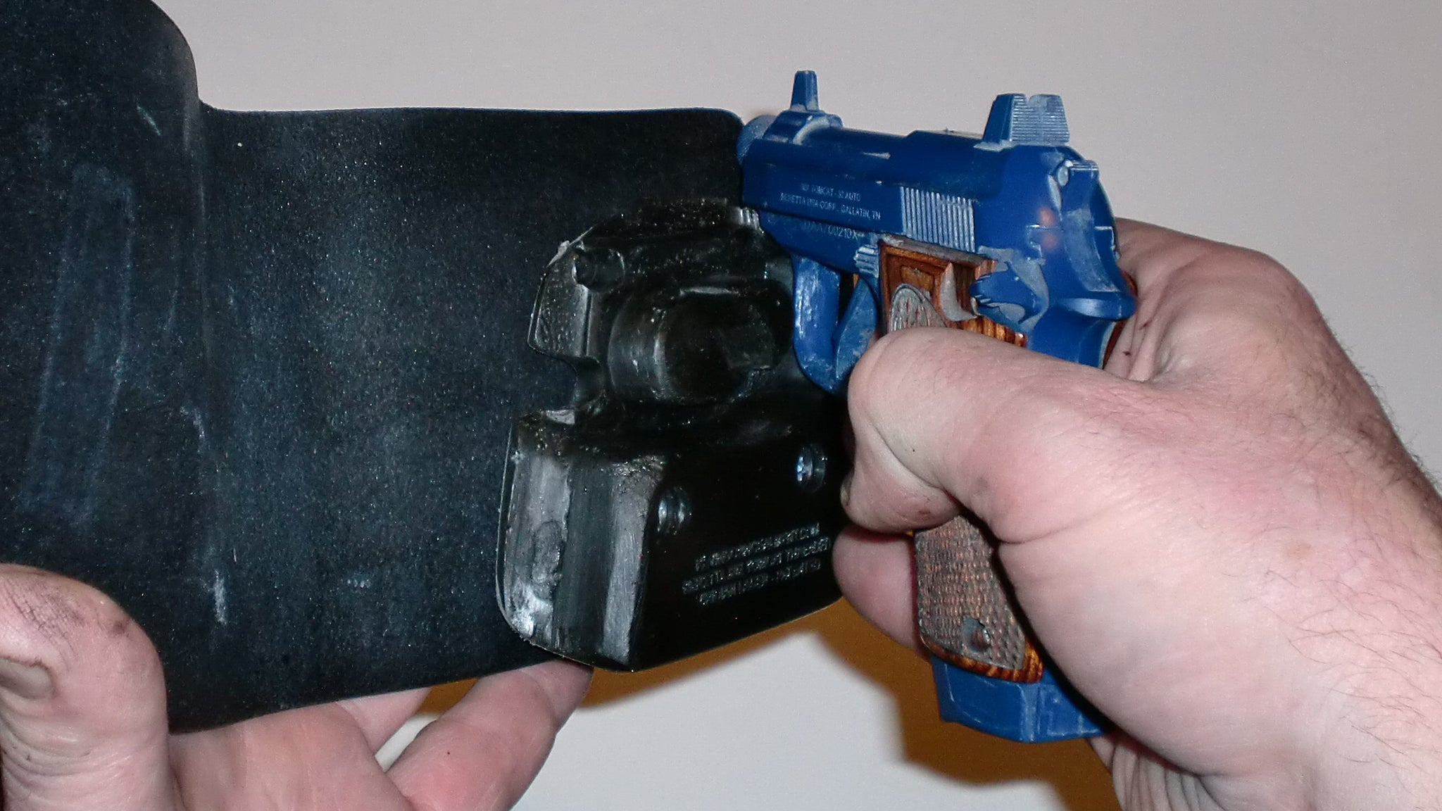 This holster uses a molded hard rubber retaining insert to secure the pistol in place inside the leather covering when the covering is closed. The retainer also keeps the thickness of the holster uniform, insuring the gun won’t print. To draw it, take the wallet holster out of your pocket, open the cover, and simply flip the pistol out into your other hand.